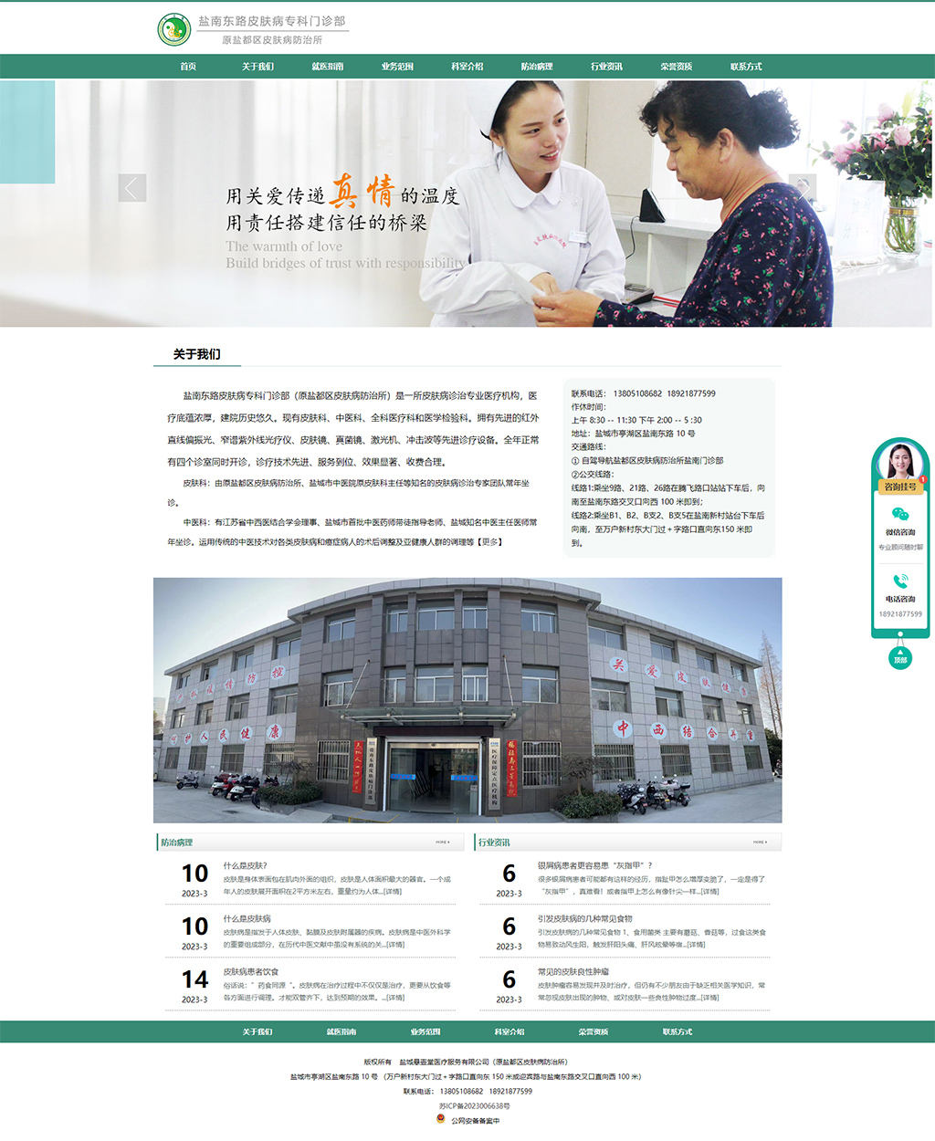 網(wǎng)站設(shè)有:關(guān)于我們、就醫(yī)指南、業(yè)務(wù)范圍、科室介紹及聯(lián)系方式(在線和電話兩種)及交通路線說明。所有的設(shè)置都是為了讓更多的用戶能充分了解鹽都皮防所,能及時高效的聯(lián)系,并能清晰了解如何到達(dá)鹽都皮防所。